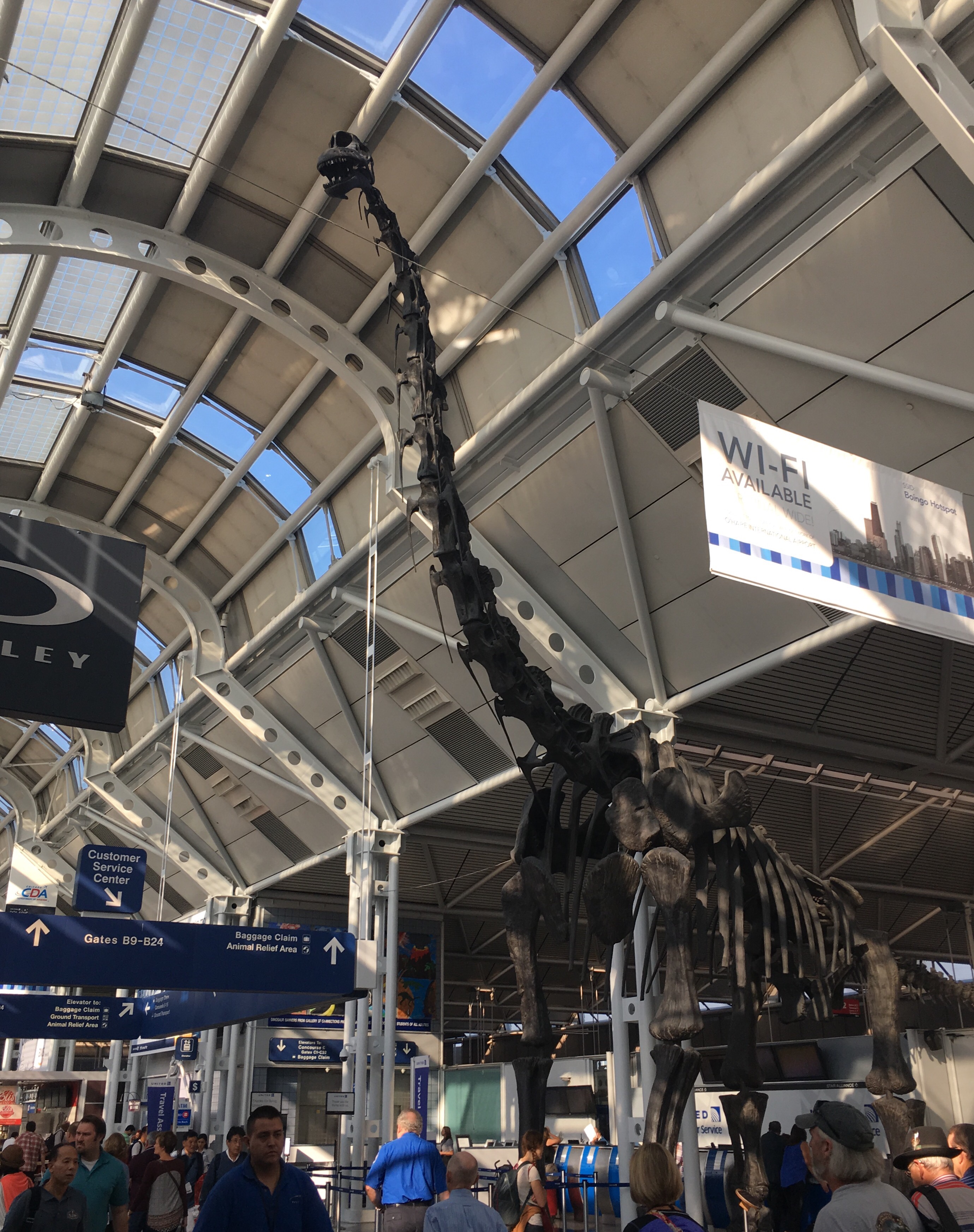 I had not been at O’Hare Airport in decades. The arched terminal ceilings looked vaguely familiar, but I don’t remember the huge dinosaur statue. It’s surprising that we avoided O’Hare for many years, even though I flew into there many times during Emmaus years. When we lived in Iowa, John and I would most often fly into Moline/Quad Cities. It used to be much cheaper and less car travel than either Des Moines or Kansas City.